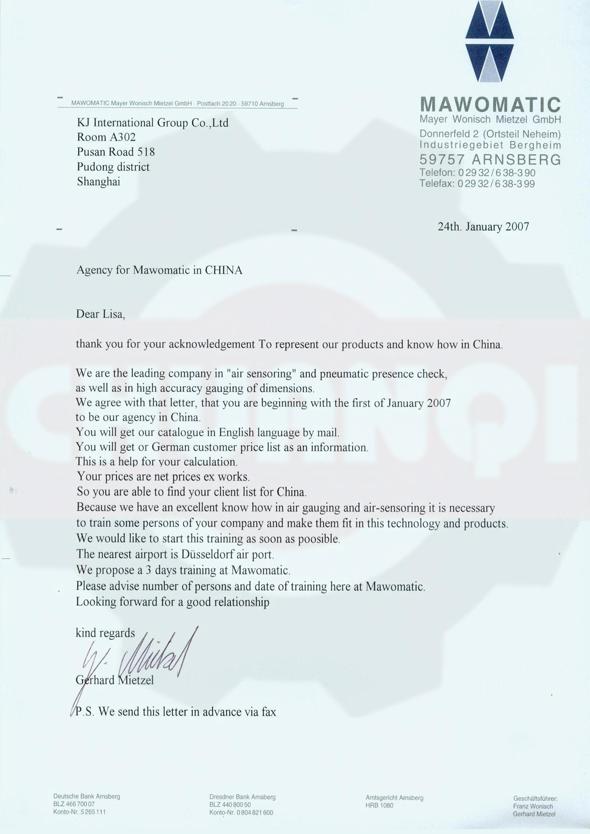 德國MAWOMATIC 公司持續不斷地向市場推出其在氣動測量與控制系統領域中的新發明,產品主要包括開關、PEL測量和控制系統、空氣柜、噴嘴和空氣處理裝置等。